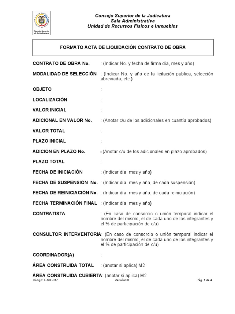 Formato Acta de Liquidacion Contrato de Obra Liquidación Póliza de