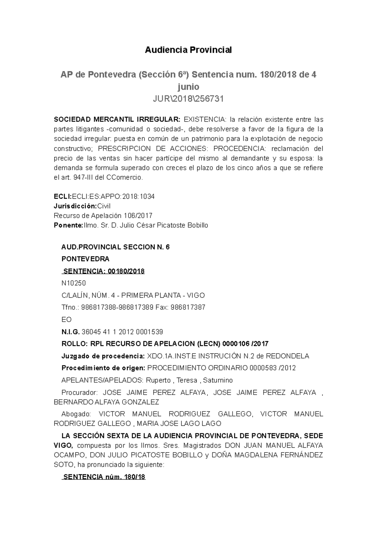 Orden: Civil Fecha: 01 de Octubre de 2019 Tribunal: AP - Pontevedra Ponente: ALMENAR BELENGUER, MANUEL Nº de sentencia: 513/2019 Nº de recurso: 476/2019 Núm. Cendoj: 36038370012019100508 Núm. Ecli: ES:APPO:2019:2062 Núm. Roj: SAP PO 2062/2019
