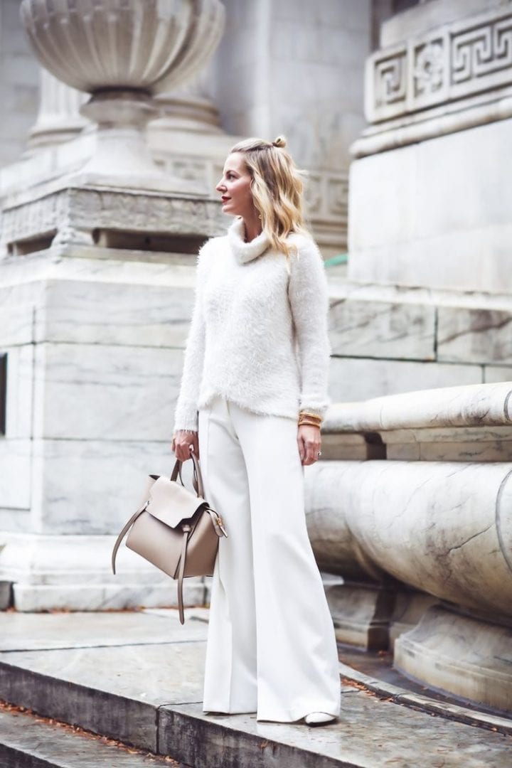 Dar en el blanco. Una de las mejores fórmulas para combinar los pantalones blancos consiste en optar por prendas de su mismo tono y crear un estilismo blanco perfecto para invierno haciendo uso.